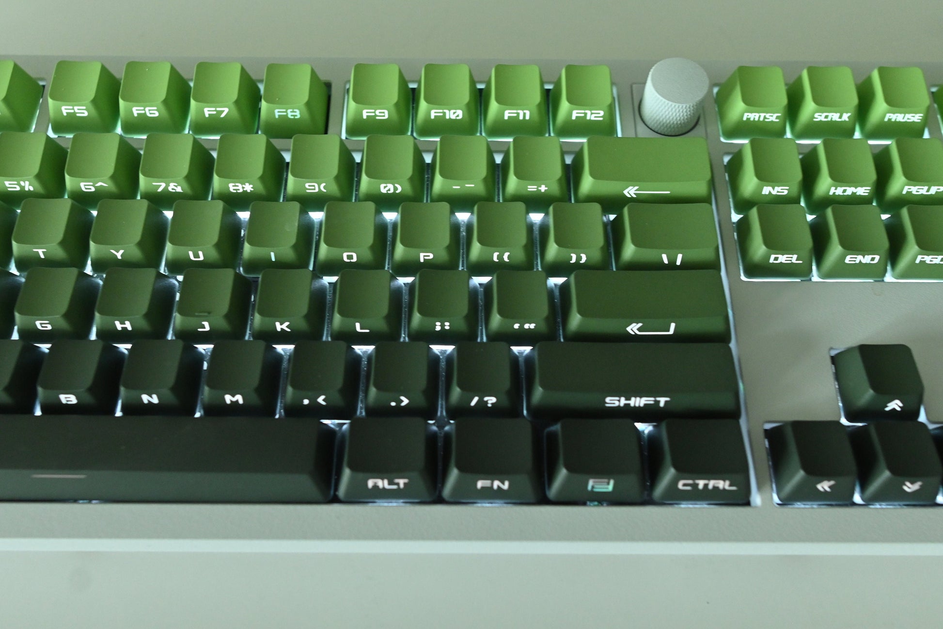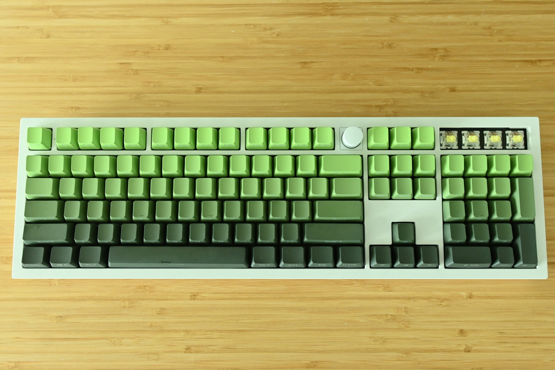 This beautiful matcha green gradient keycap set is features backlit/ translucent keycaps allowing light to shine through the letters on the keycaps. There is also a choice between having the letters appear on the top or on the side of the keycaps. The matcha colors will add a refreshing and soothing look to your keyboard. Note that the 104 keys version will not have enough keys for a full size 108 keys keyboard which is why the pic shows 4 keycaps with the switches being exposed. FYI there may be compatibility issues with the right Shift key for some keyboards such as 75%. Please make sure to check sizes before buying.