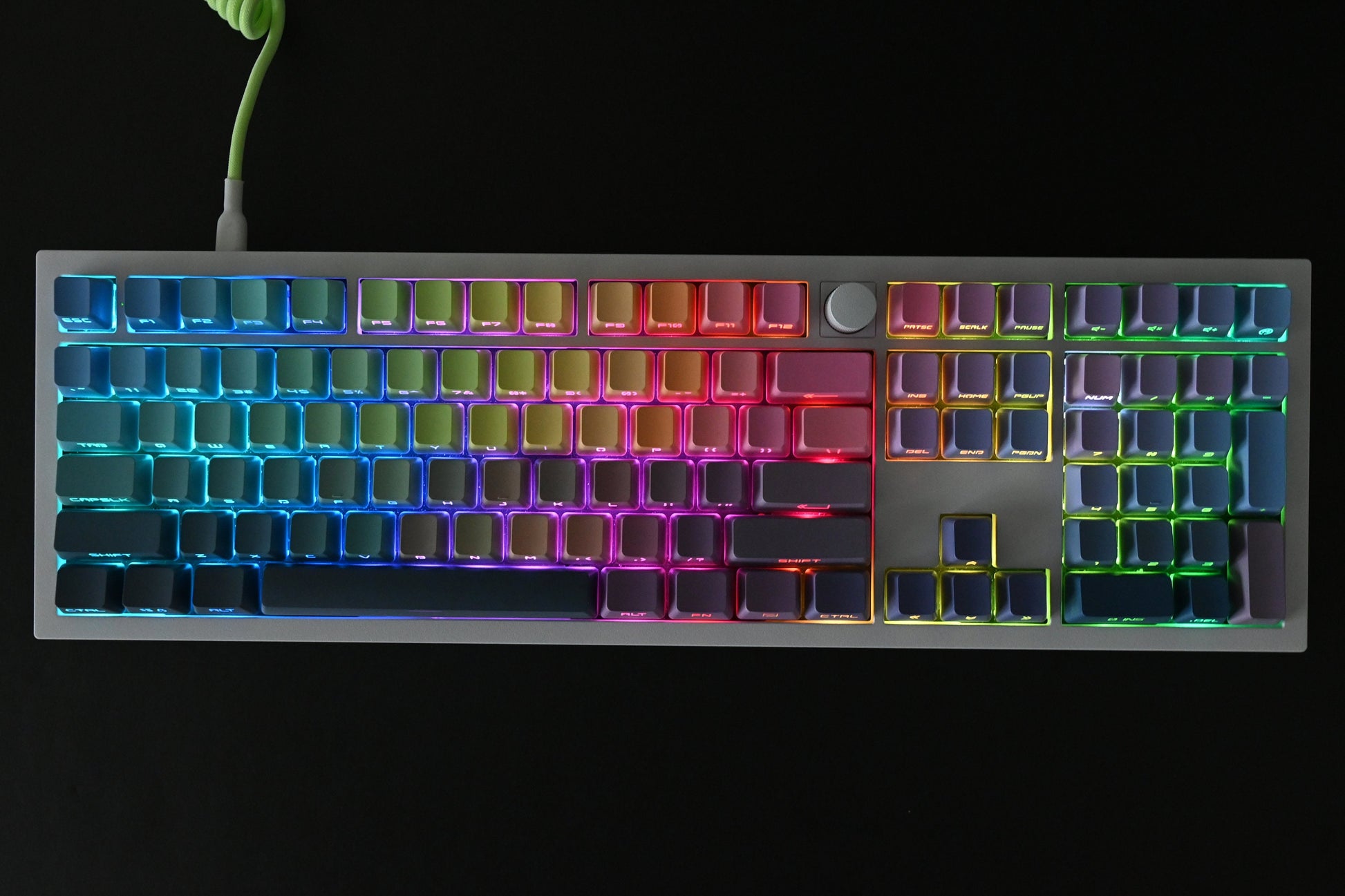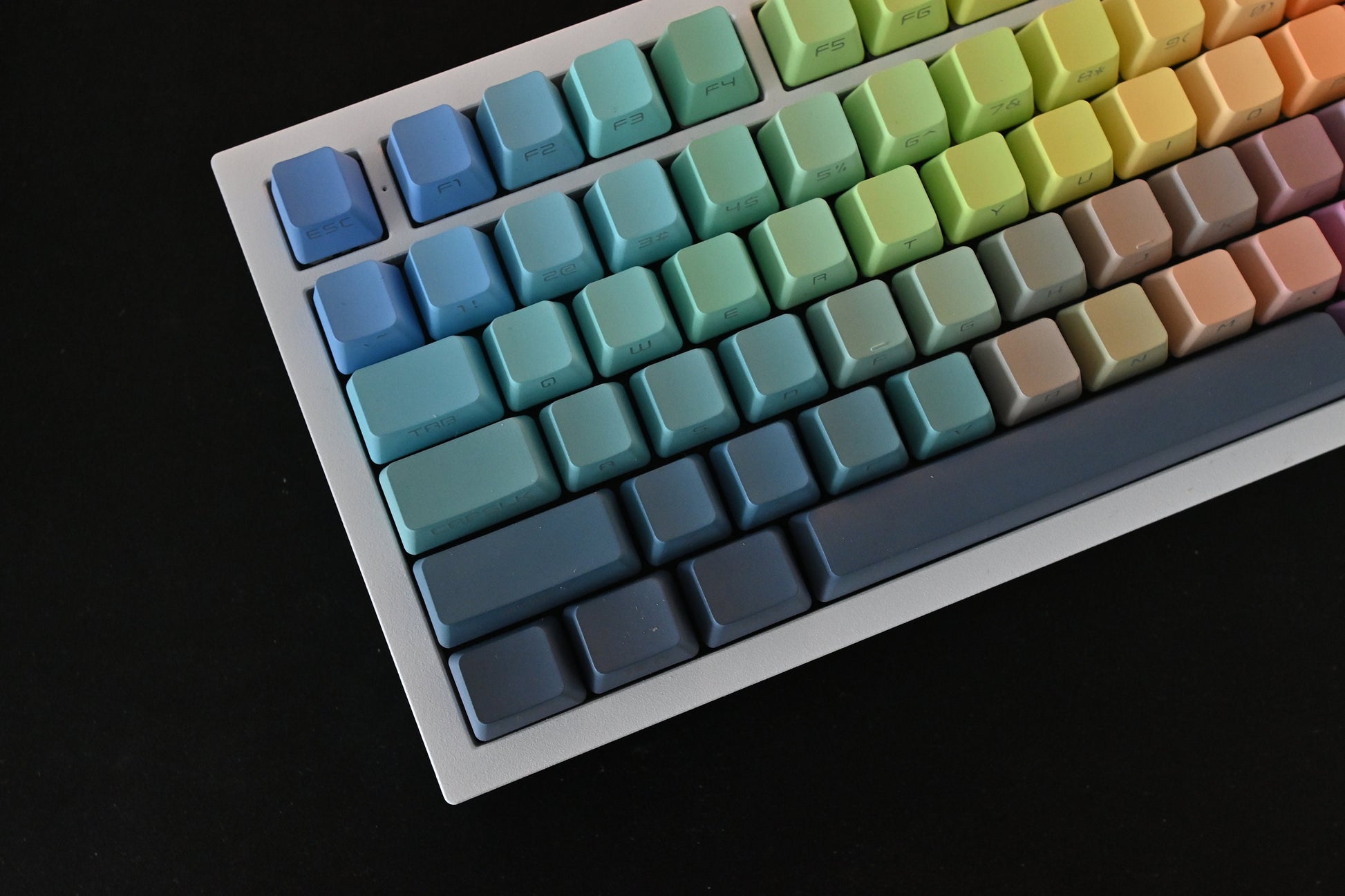 This soft pastel rainbow color gradient keycap set features all the colors of the rainbow along with letters printed on the side and backlit letters that allow light to shine through the keycaps!