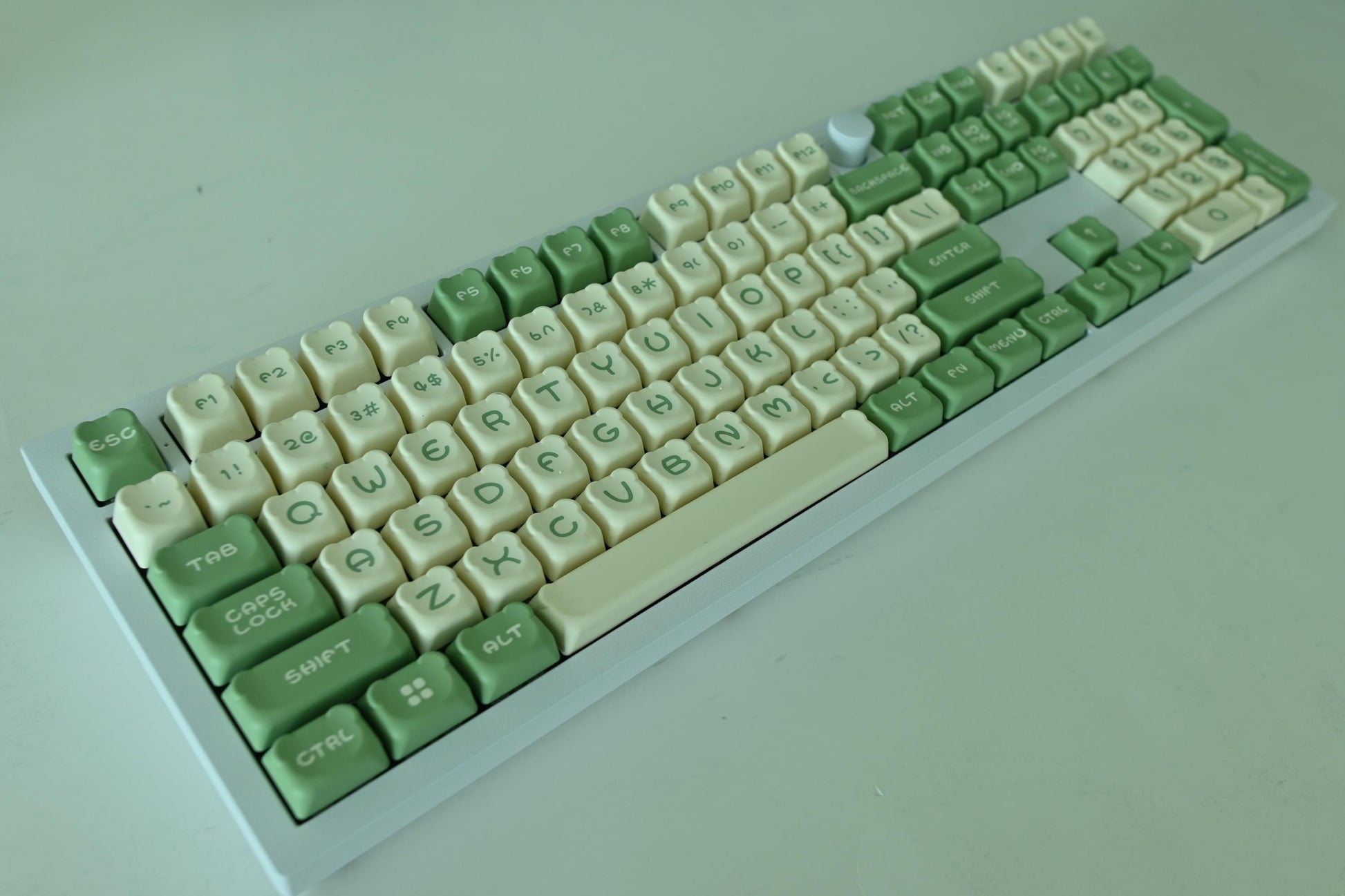 This minimalist keycap set features a green matcha theme. The beige and green color combination will add a soothing calm and functional cafe look to your keycap set. It also features MOA keycaps which have a shape of bear ears and large text on the letters that gives the keycap set a cute and youthful look.