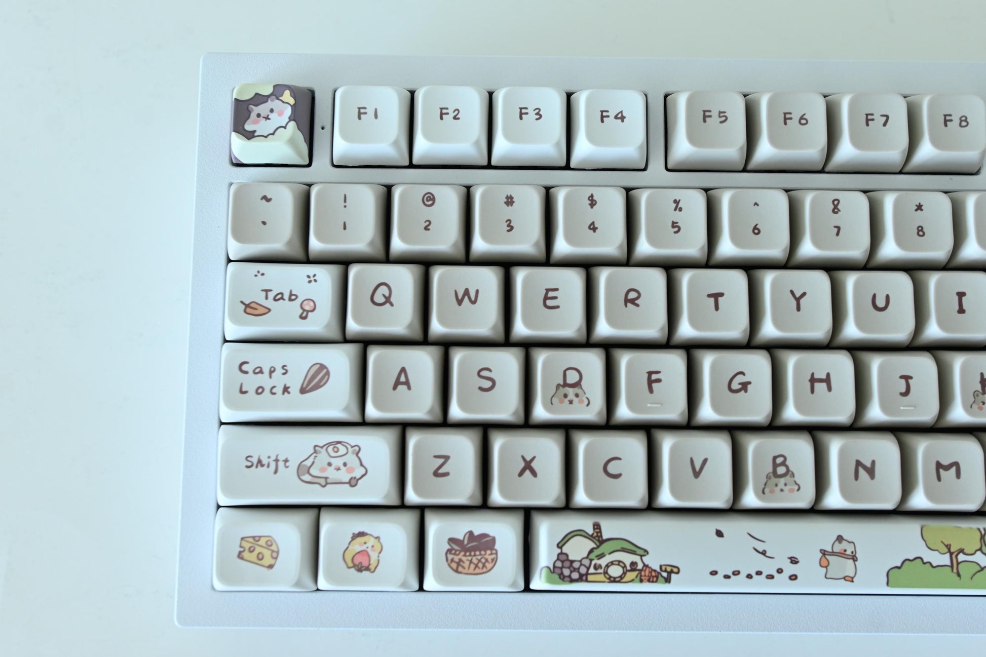 This adorable hamster mouse keycap set features multiple images of a cartoon hamster mouse in different poses, and features the night sky as part of the keycap set theme.