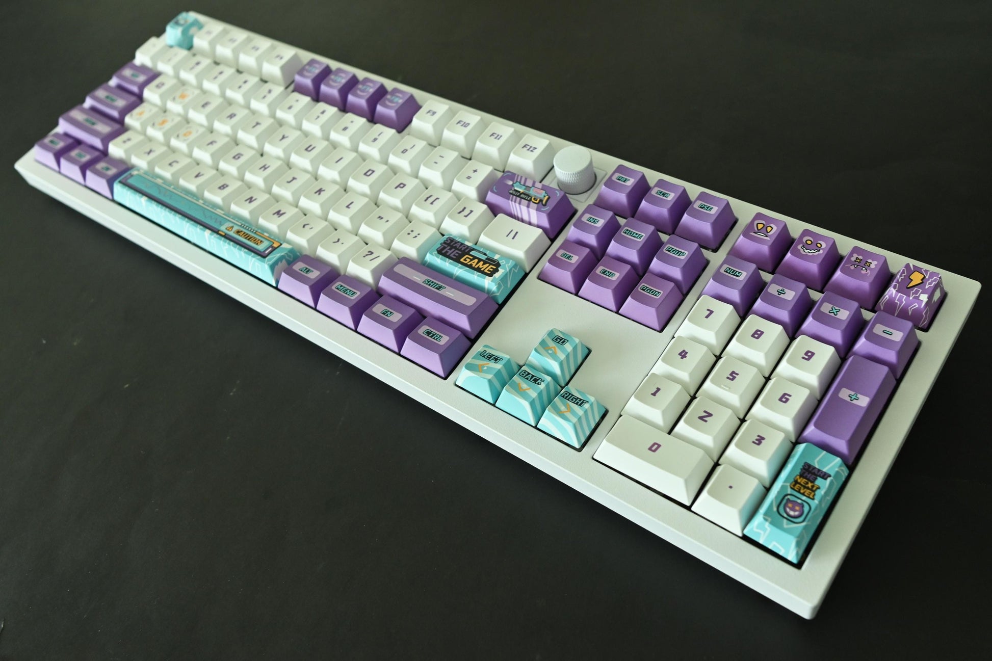 This retro arcade game theme keycap set has bold purple and blue colors that will make your mechanical keyboard pop in color. It also features fonts and an aesthetic that reminds you of video games from the early 2000's.