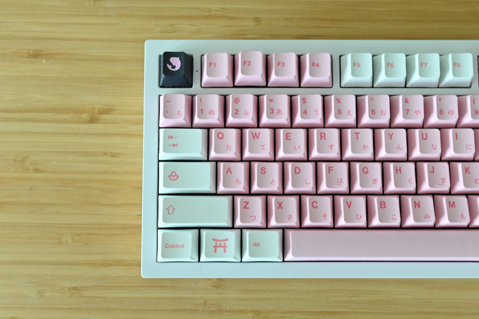 This white and pink sakura cherry blossom keycap set features light pink hues and soft touches. There are many keycaps included that evoke Japanese motifs such as the cherry blossom, Japanese torii (gate), and Mt. Fuji etc.